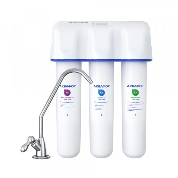 Три картриджа последовательно очищают воду от видимых механических примесей и растворенных вредных веществ. Блок механической очистки К5 продлевает ресурс сорбционных модулей, модуль глубокой очистки К2 – отфильтровывает частицы до 3 микрон. Третий модуль К7 обеспечивает финишную очистку от частиц до 0,8 микрон (что в 125 раз тоньше человеческого волоса).